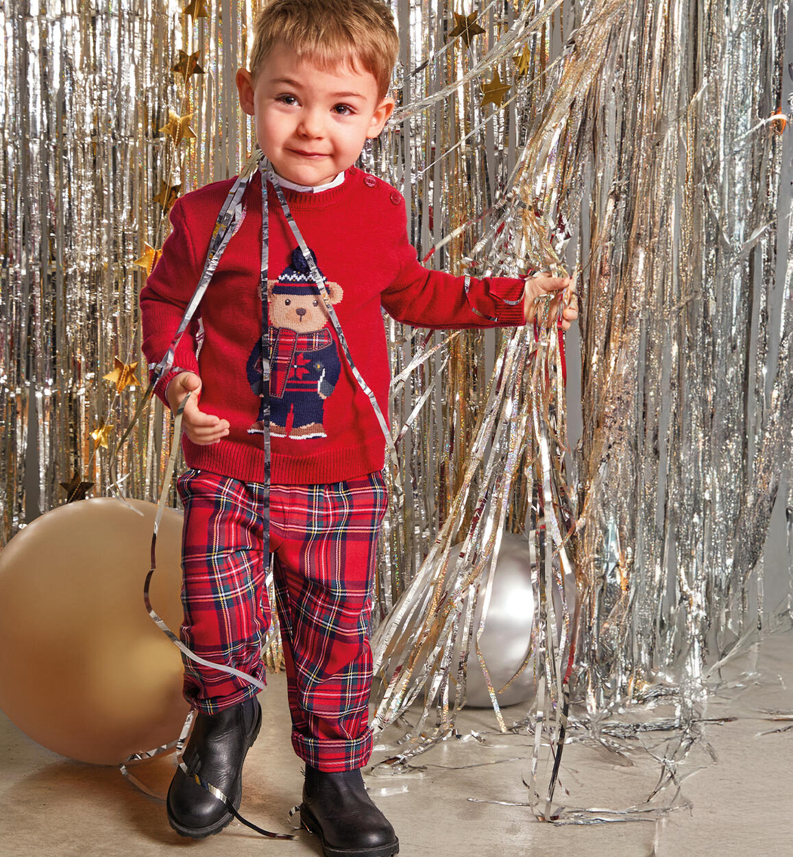Pantalone per bambino iDO 9 mesi - 8 anni realizzato in twill manopesca, fantasia scozzese. Modello con tasche, vita regolabile con elastico asolato interno. Vestibilità regular